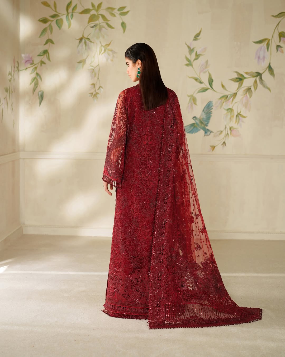 - Dupatta: Embroidered net dupatta with ornate side and pallu borders.
