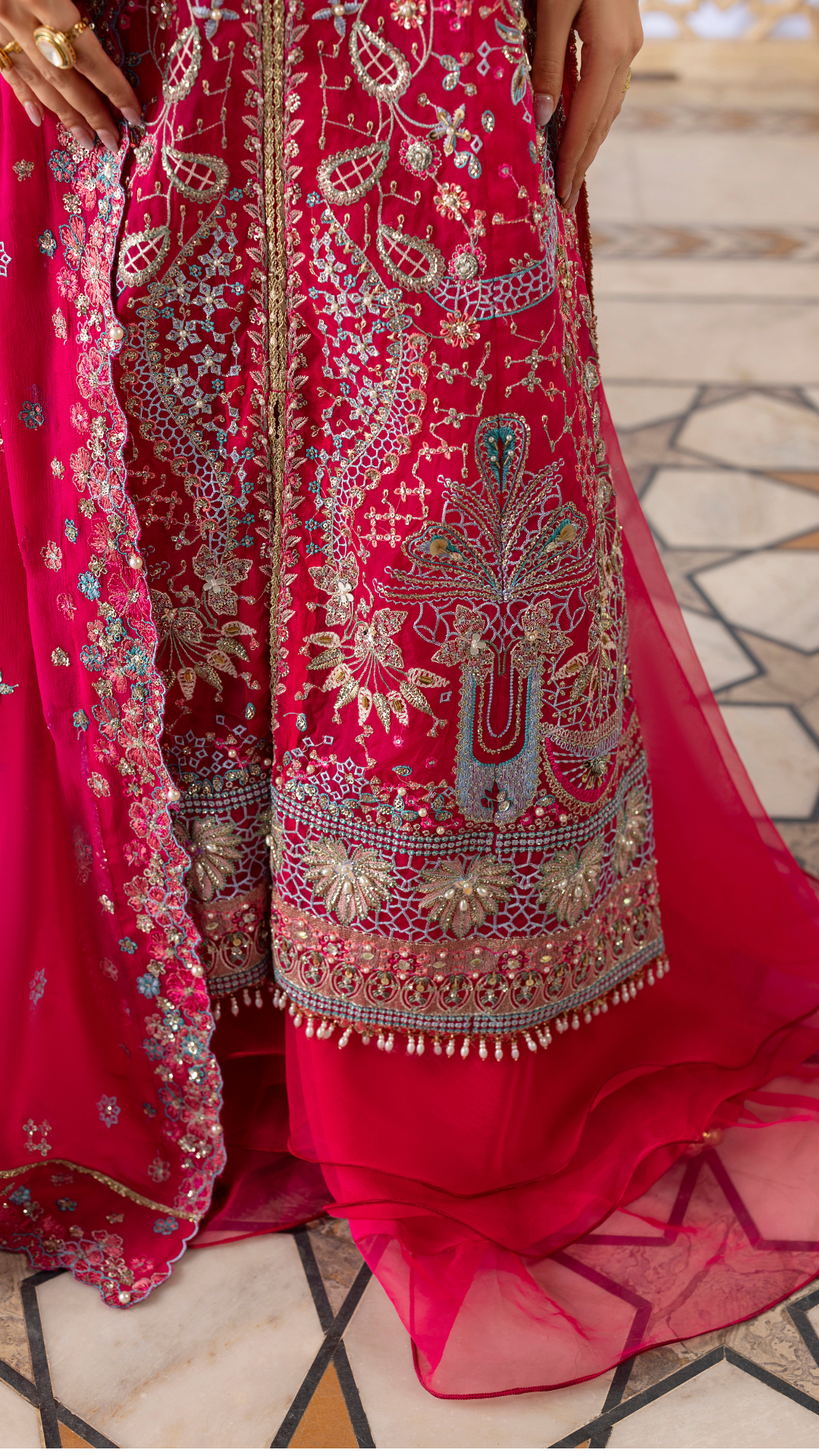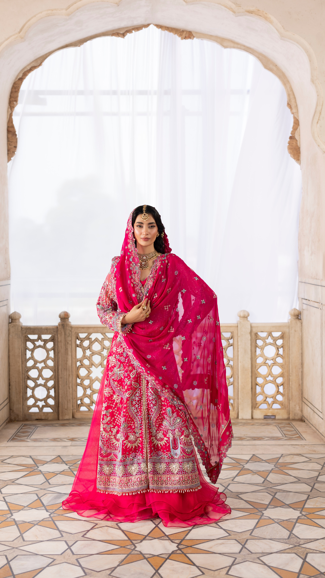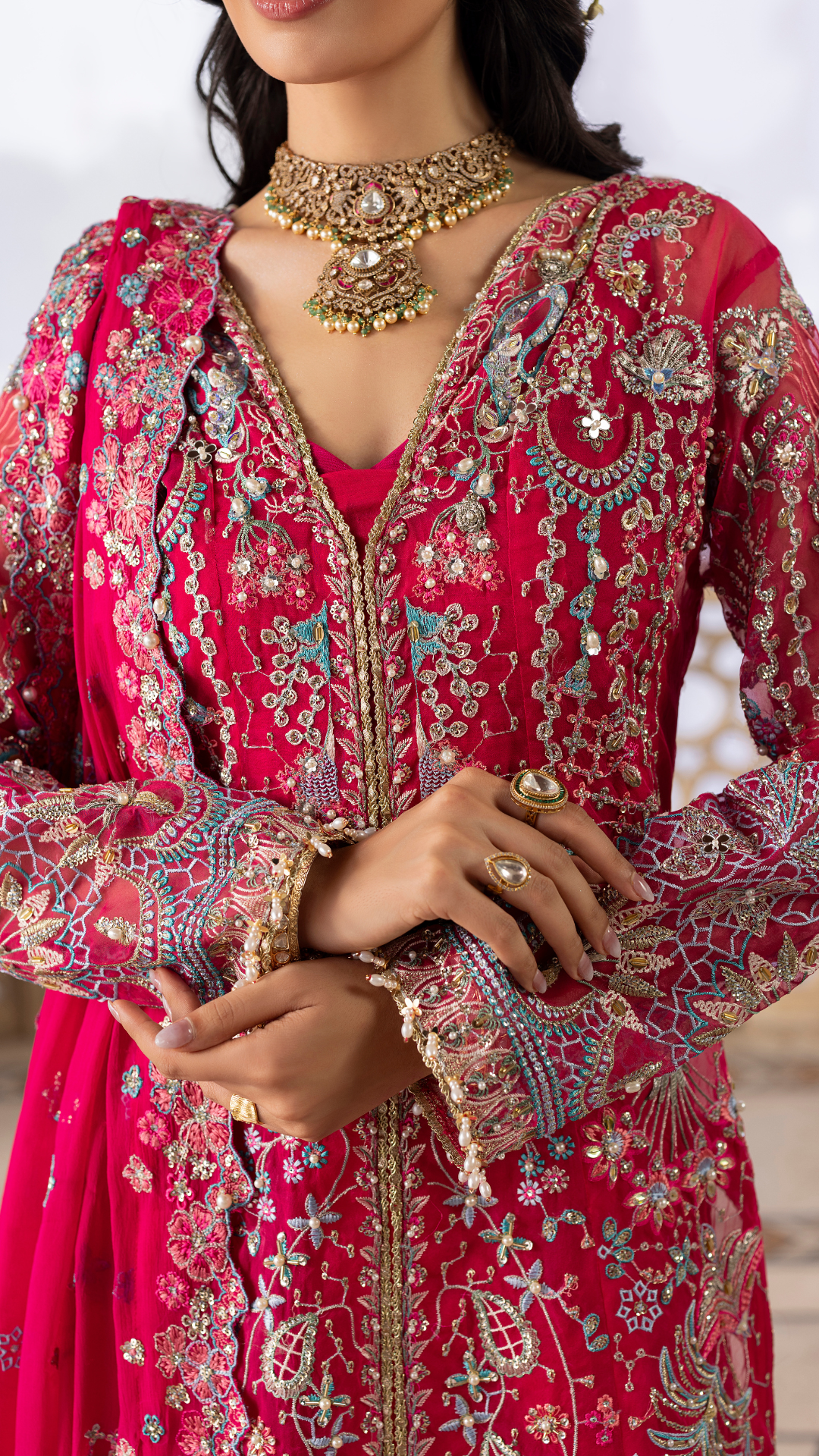 Radiant and refined, Fuchsia from the Ember Collection embodies the spirit of celebration in a striking fuchsia pink hue. Crafted on a sheer organza base, the ensemble features hand-embellished panels, sleeves, and front border adorned with delicate threadwork, sequins, and intricate craftsmanship that glisten with festive charm. Paired with an embroidered chiffon dupatta enhanced with organza pallu borders and a sleek raw silk trouser, Fuchsia is a perfect blend of vibrance, elegance, and timeless sophistication.