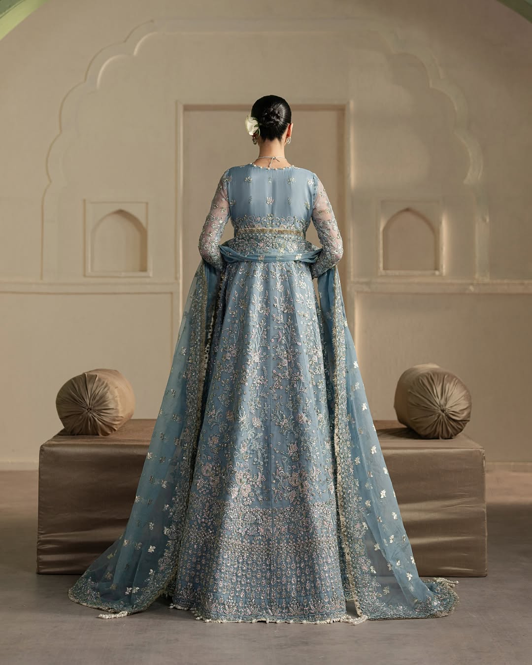This enchanting powder blue peshwas is a vision of elegance, crafted on delicate net fabric and lavishly adorned with silver and pearl-toned embroidery that shimmers with timeless allure. The fitted bodice flows seamlessly into a voluminous flared silhouette, while the sheer embroidered sleeves add a touch of ethereal grace. Finished with a coordinating dupatta edged in ornate detailing, this ensemble exudes regal sophistication.
