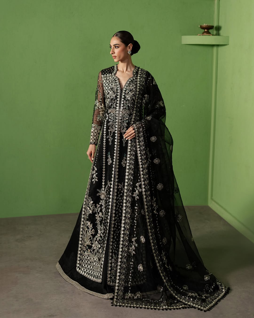 This striking black ensemble is a vision of timeless sophistication, crafted on sheer net fabric and lavishly adorned with silver and ivory embroidery that glimmers with regal allure. The structured bodice flows into a voluminous flared silhouette, while the intricately detailed sheer sleeves add a touch of modern elegance. Paired with a coordinating dupatta edged in ornate embellishments, this ensemble radiates grandeur, making it perfect for weddings and festive soirées